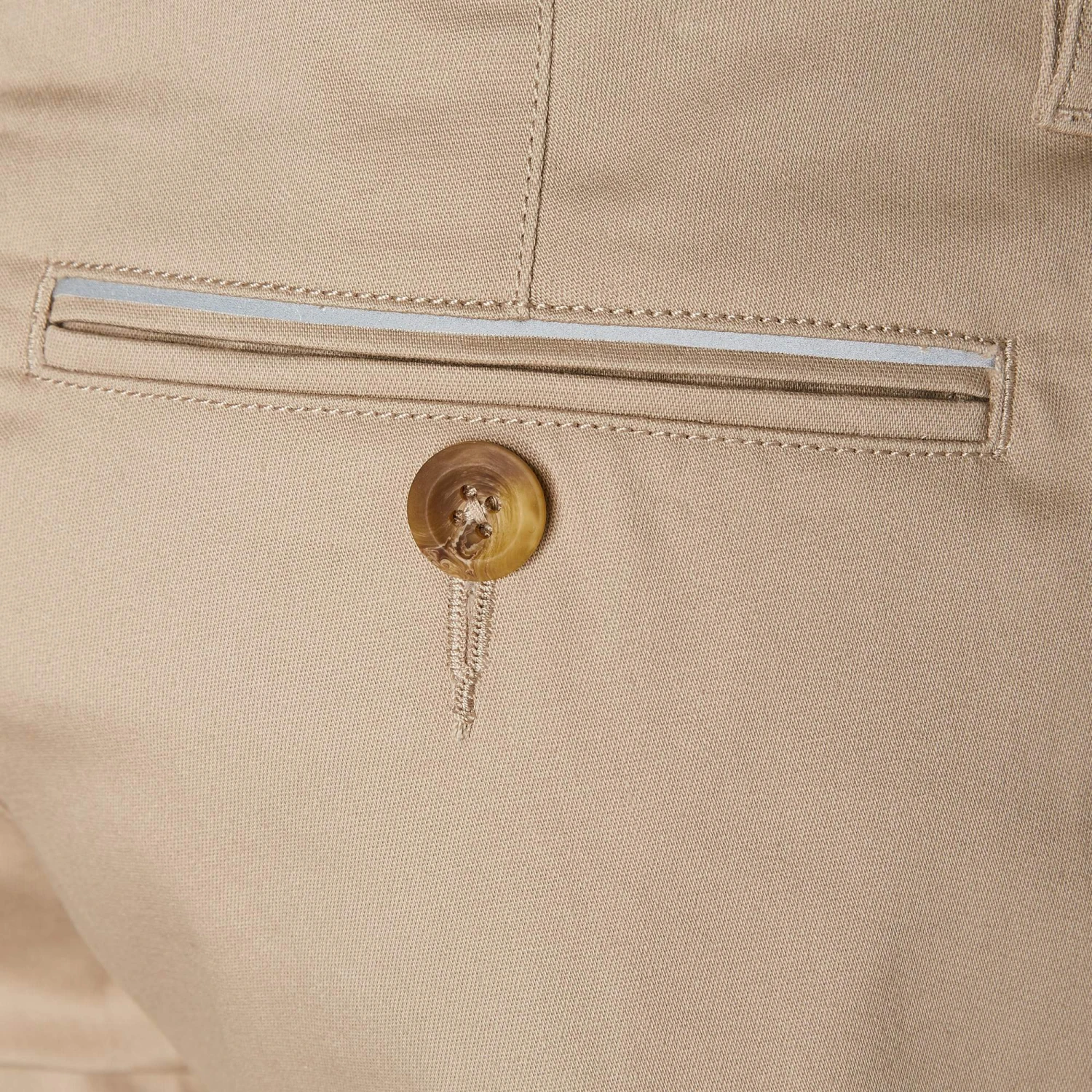 Doch damit nicht genug, die Shorts hat nämlich noch ein paar Überraschungen parat: Auf der Innenseite des Hosenbundes ist ein Silikon-Streifen angebracht, der die Hose auch bei ausladenden Bewegungen an Ort und Stelle hält. Die Gesäßtaschen mit Knopf verleihen der Hose eine schöne, bürotaugliche Optik. Die rechte Tasche ist mit einer reflektierenden Paspel ausgestattet. Und auch wenn du die Beine ein Stück hochkrempelst, kommen reflektierende Paspeln zum Vorschein. So sorgt die Hose dafür, dass du auch nach Einbruch der Dunkelheit im Straßenverkehr besser gesehen wirst. Äußerst praktisch, zum Beispiel, wenn du mit dem Fahrrad zur Arbeit fährst!