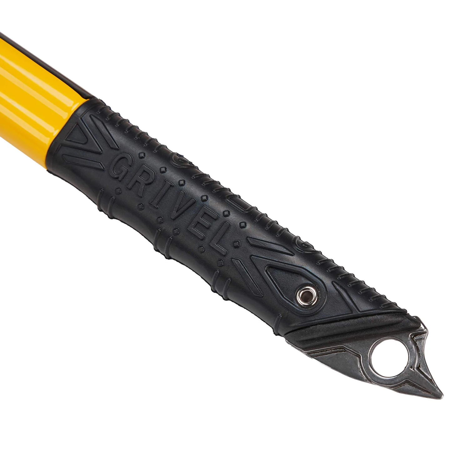 Die bissige Haue wurde in einem Stück aus zähem, heiß geschmiedetem CroMo-Stahl gefertigt und dringt problemlos in Eis und harten Firn ein. Der oben leicht gebogene Schaft läuft nach unten hin gerade aus und endet in einem spitzen Dorn.