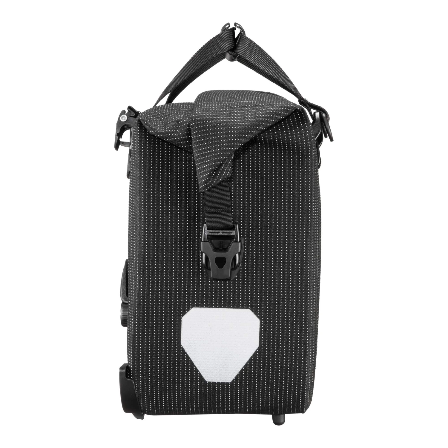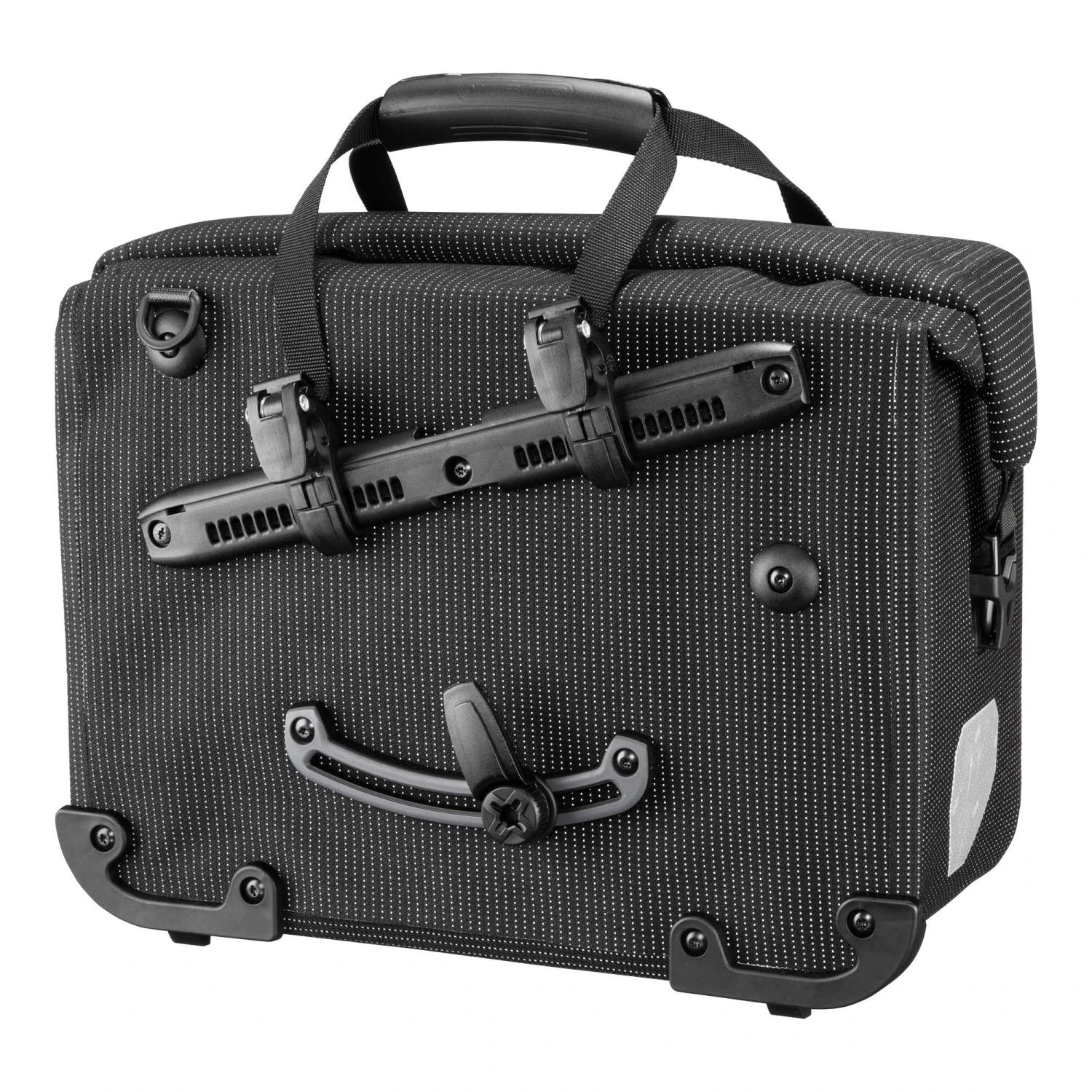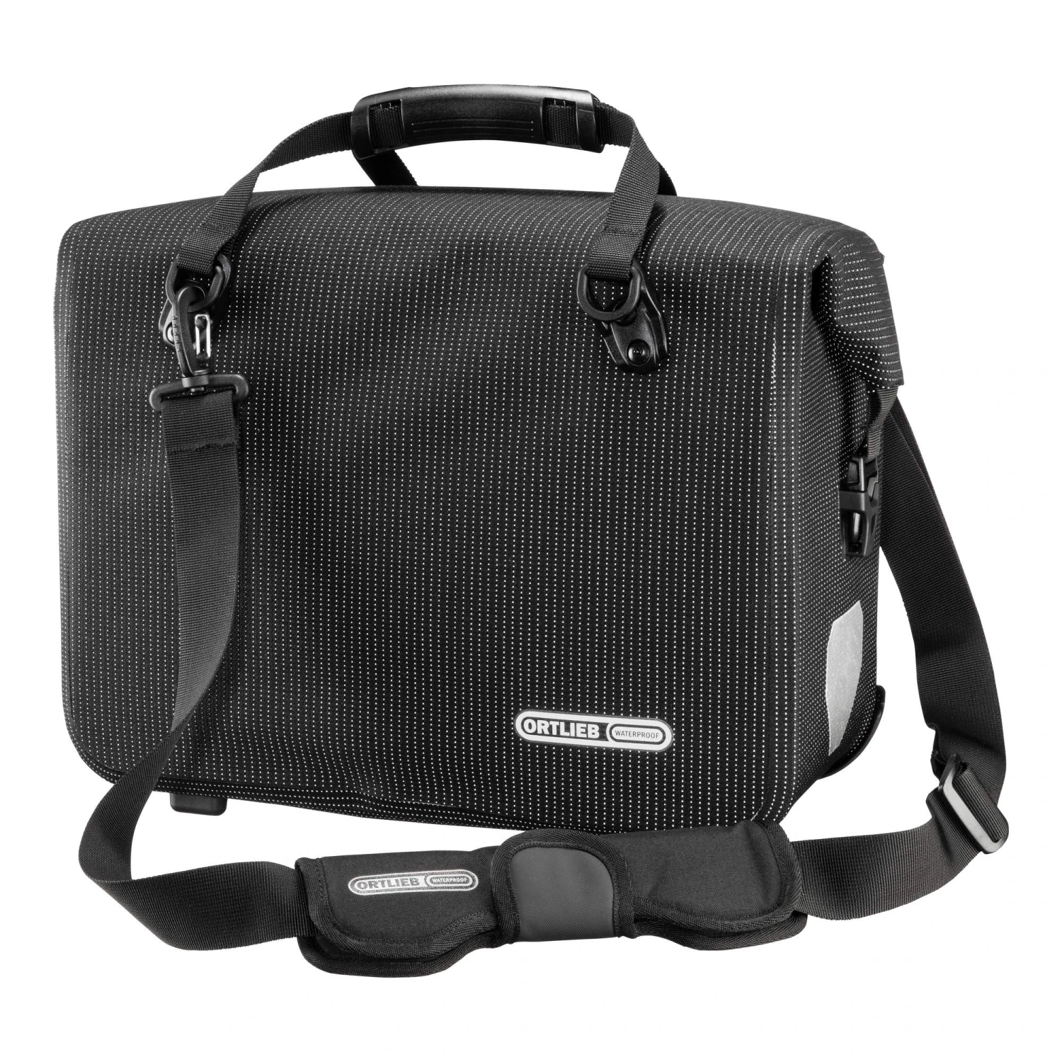 Tagsüber elegant-schwarz, nachts ein Leuchtfeuer für die Sicherheit: Die wasserdichte Fahrradaktentasche mit Reflexgarn wird im Dunkeln zum großen Reflektor.