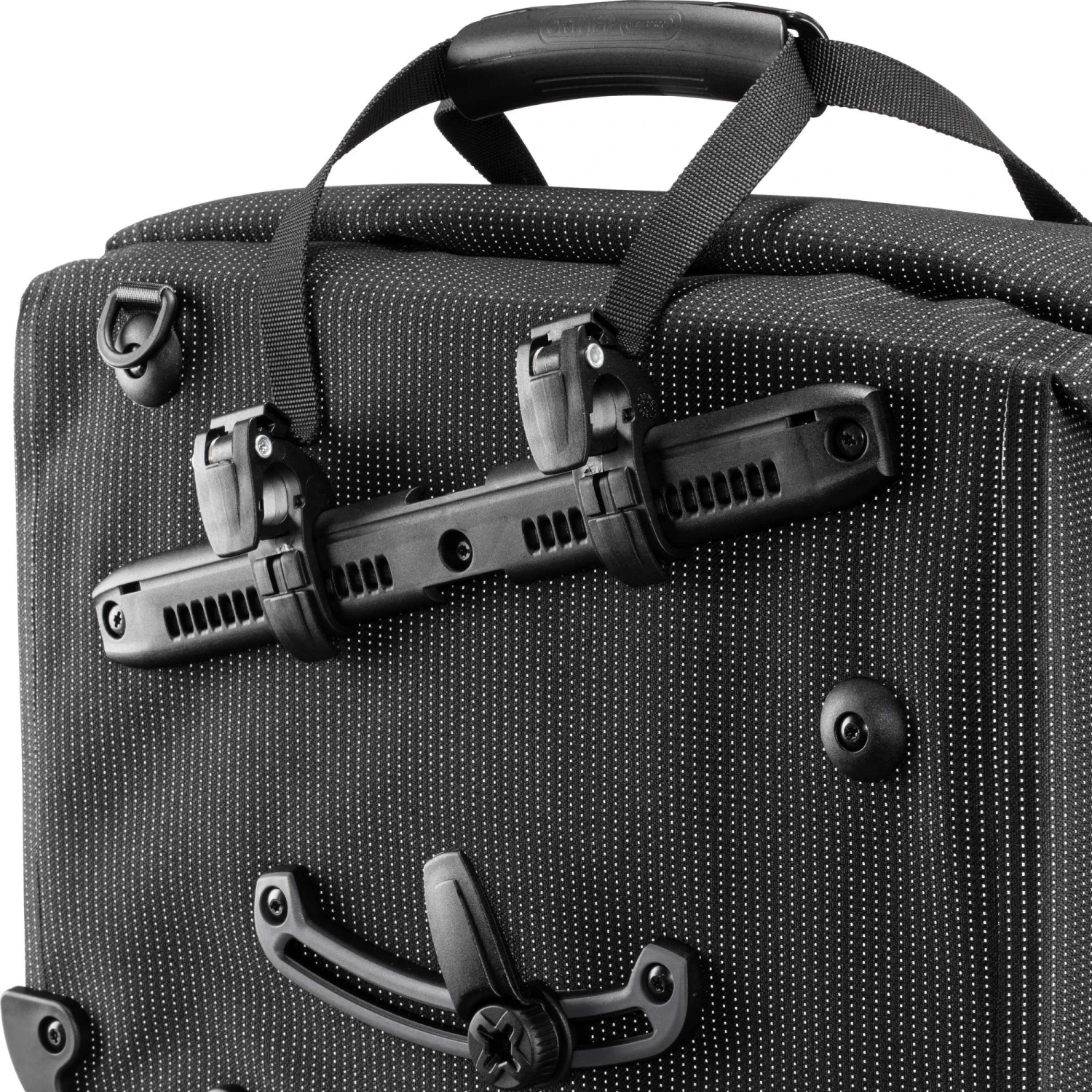 Aufhängung für Gepäckträger mit einem Rohrdurchmesser von 8 bis 16 mm. Die beiden oberen Haken lassen sich werkzeugfrei auf der aus einem Stück gefertigten Schiene verschieben und durch Anheben des Tragegriffs öffnen. Der untere Arretierungshaken ist ebenfalls auf einer halbelliptischen Schiene individuell anpassbar und werkzeugfrei in 15-Grad-Schritten drehbar. Ein Scheuerschutz im unteren Bereich der Taschen und an der Auflagefläche des Gepäckträgers beugt Abrieb vor.