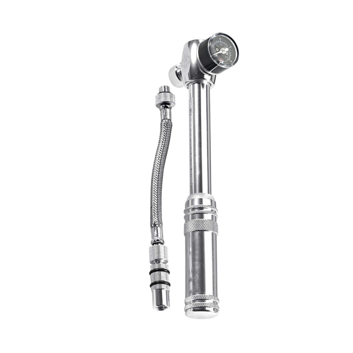 Der Stahlflexschlauch lässt sich ohne Druckverlust abschrauben, ein integriertes Drehrad regelt den Druckablass. Max. 290 Psi/20 bar. Der Schlauch lässt sich abgeschraubt mit der Pumpe in der beiliegenden Nylon-Tasche kompakt verstauen.